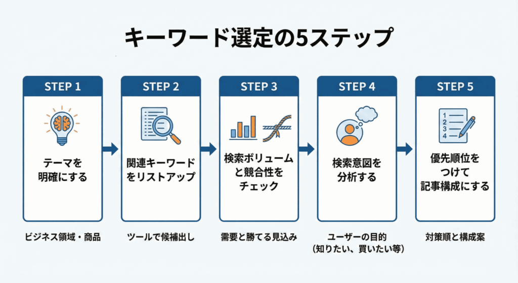 SEOで成果を出すためには、キーワード選定を単なる「語句を探す作業」として扱うのではなく、戦略的に進めることが重要です。ここでは、初心者でも実践できる5つのステップに分けて解説します。