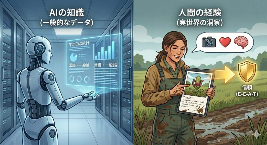 最大の理由は、AIコンテンツの汎用化です。AIを使えば、誰でも「平均点以上の専門的な文章」を大量生産できるようになりました。しかし、AIには絶対に生み出せないものがあります。それが「Experience(経験)」です。